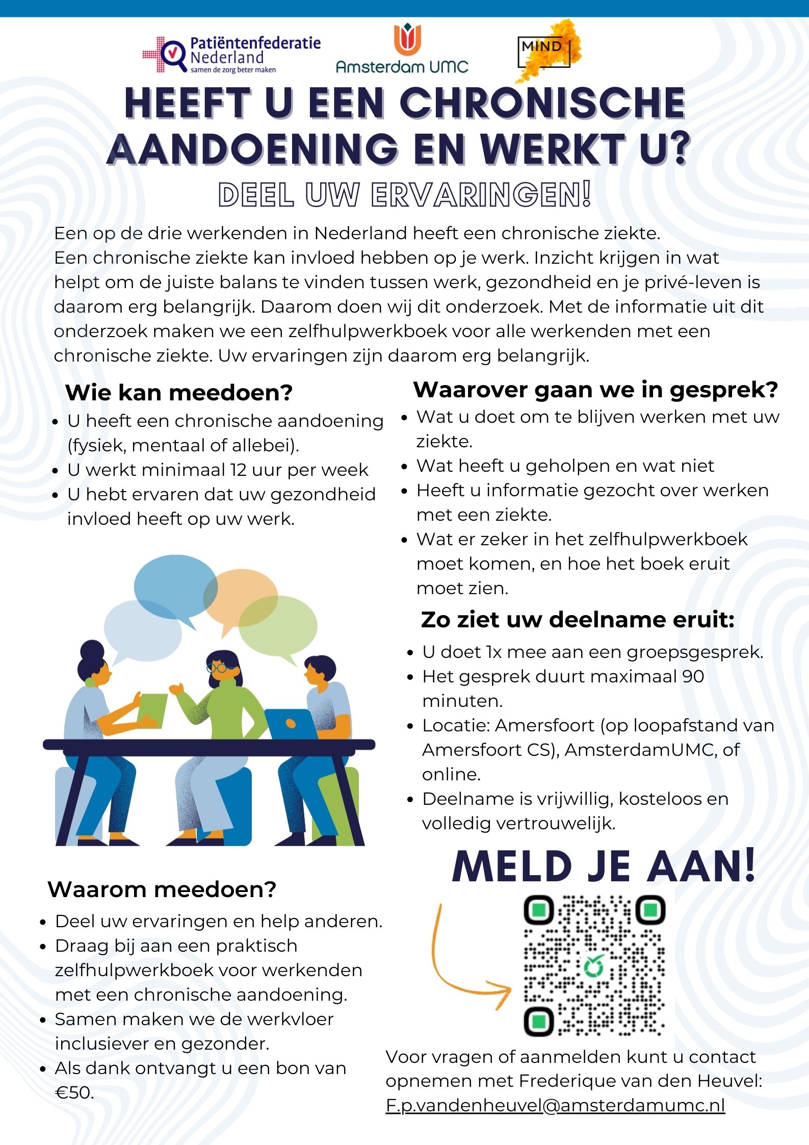 Mind, Patiëntenfederatie Nederland en Amsterdam UMC doen onderzoek. Met de uitkomsten maken ze een praktisch zelfhulpwerkboek voor werkenden met een chronische aandoening. Jouw ervaring is daarbij onmisbaar 💬